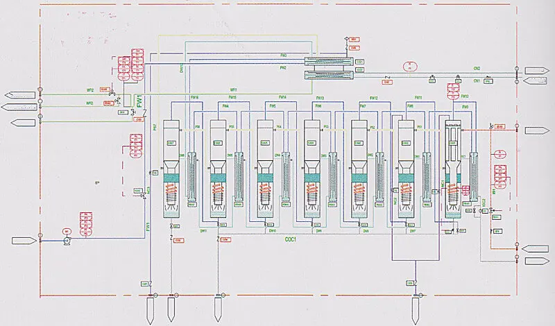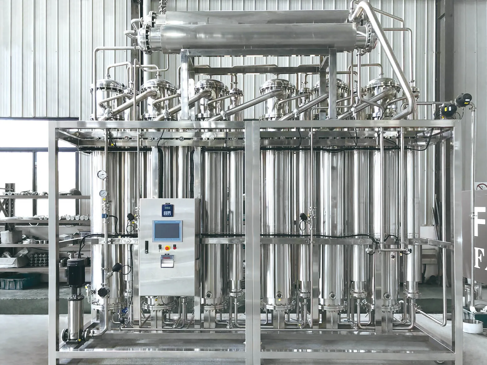 Multi-effect water distiller adopts Level 3 centrifugal separation technology. Siemens S7 series control system has Chinese and English operating language, water inlet booster pump with standard configuration, dashpot and collection tank.The equipment is equipped standard with plant steam reducing valve, the device for continuous emission of non-condensable gas. In addition, the equipment continuously discharge the residual liquid and record the electrical conductivity of water for injection and the valve location. It is conducted with complete equipment manufacture factory acceptance test and the inlet water uses deionized water or RO water.